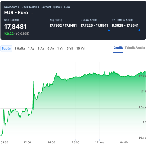 Merkez Bankası kararı sonrası döviz kurlarında yeni zirve: Dolar, 15,74, euro 17,84 lirayı gördü. 17 Aralık cuma gününe ise dolar 15,71 euro ise 17,81 liradan başladı.