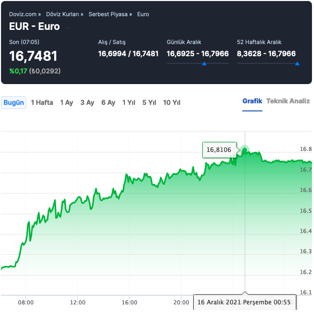 Güne 16,7408 ile başlayan Euro kuru, saat 07:29 itibarıyla %0,21 artışla 16,7536 liradan işlem görüyor. Dün en düşük 16,1749, en yüksek 16,7266 seviyelerini gören Euro, günü 16,7123 seviyesinde kapattı. Euro, 16.11.2021 tarihinde 11,4245 ile son bir ayın en düşük, 16.12.2021 tarihinde ise 16,7966 ile son bir ayın en yüksek seviyesine ulaştı. 1 Euro 16,7536 TLye karşılık gelmektedir.