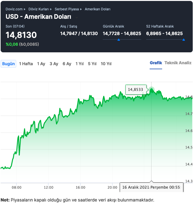 Güne 14,8183 ile başlayan Amerikan Doları kuru, saat 07:28 itibarıyla %0,06 azalışla 14,7951 liradan işlem görüyor. Dün en düşük 14,3636, en yüksek 14,8374 seviyelerini gören Amerikan Doları, günü 14,7916 seviyesinde kapattı. Amerikan Doları, 16.11.2021 tarihinde 10,0421 ile son bir ayın en düşük, 16.12.2021 tarihinde ise 14,8625 ile son bir ayın en yüksek seviyesine ulaştı. 1 Amerikan Doları 14,7951 TLye karşılık gelmektedir.