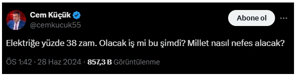 Elektriğe konut için yüzde 38 zam yapılması iktidara yakın isimleri de isyan ettirdi. Yandaş yazar Cem Küçük, elektrik zammına tepki gösterdi. Türkiye gazetesi yazarı Cem Küçük, elektrik zammına tepki göstererek, Millet nasıl nefes alacak? dedi.