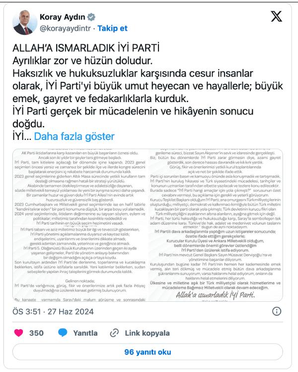 İYİ Parti kurucularından Koray Aydın, istifa metnini yayımladı. Bağımsız milletvekili olarak yoluna devam edeceğini duyuran Aydın, açıklamasına Allaha ısmarladık İYİ Parti ifadeleri ile başladı.